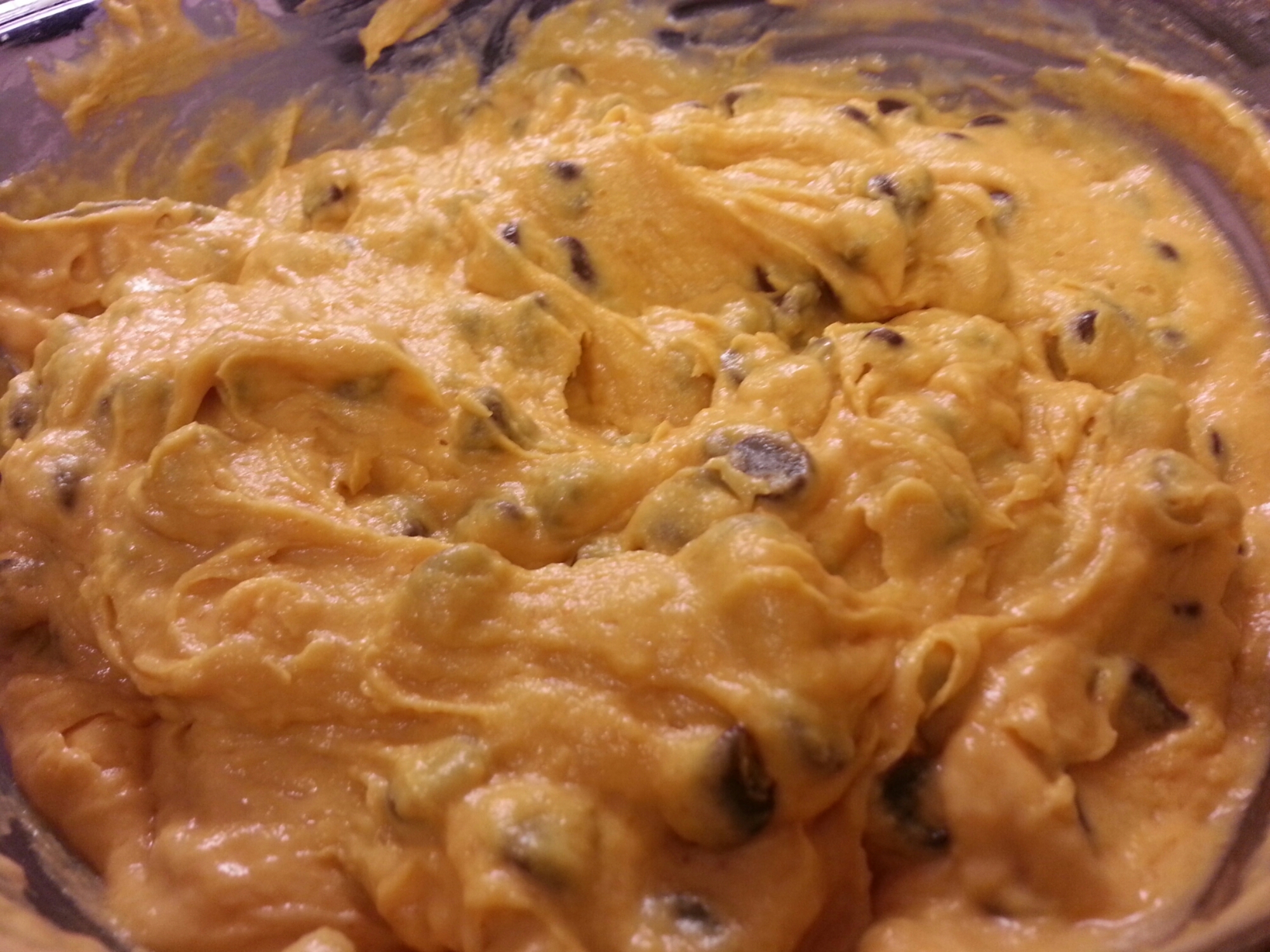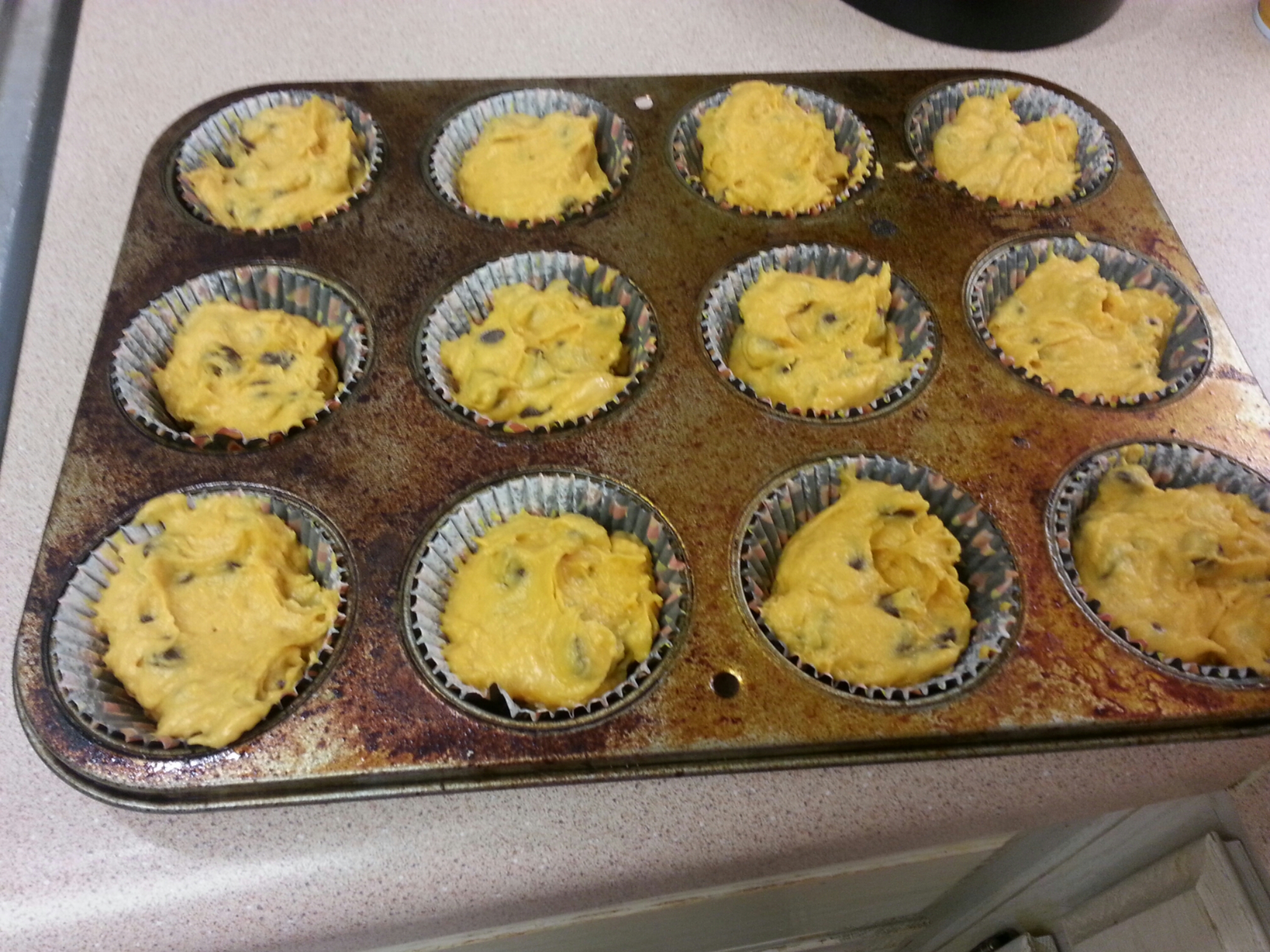 Next, spray baking cups with non stick spray and fill with pumpkin mixture.