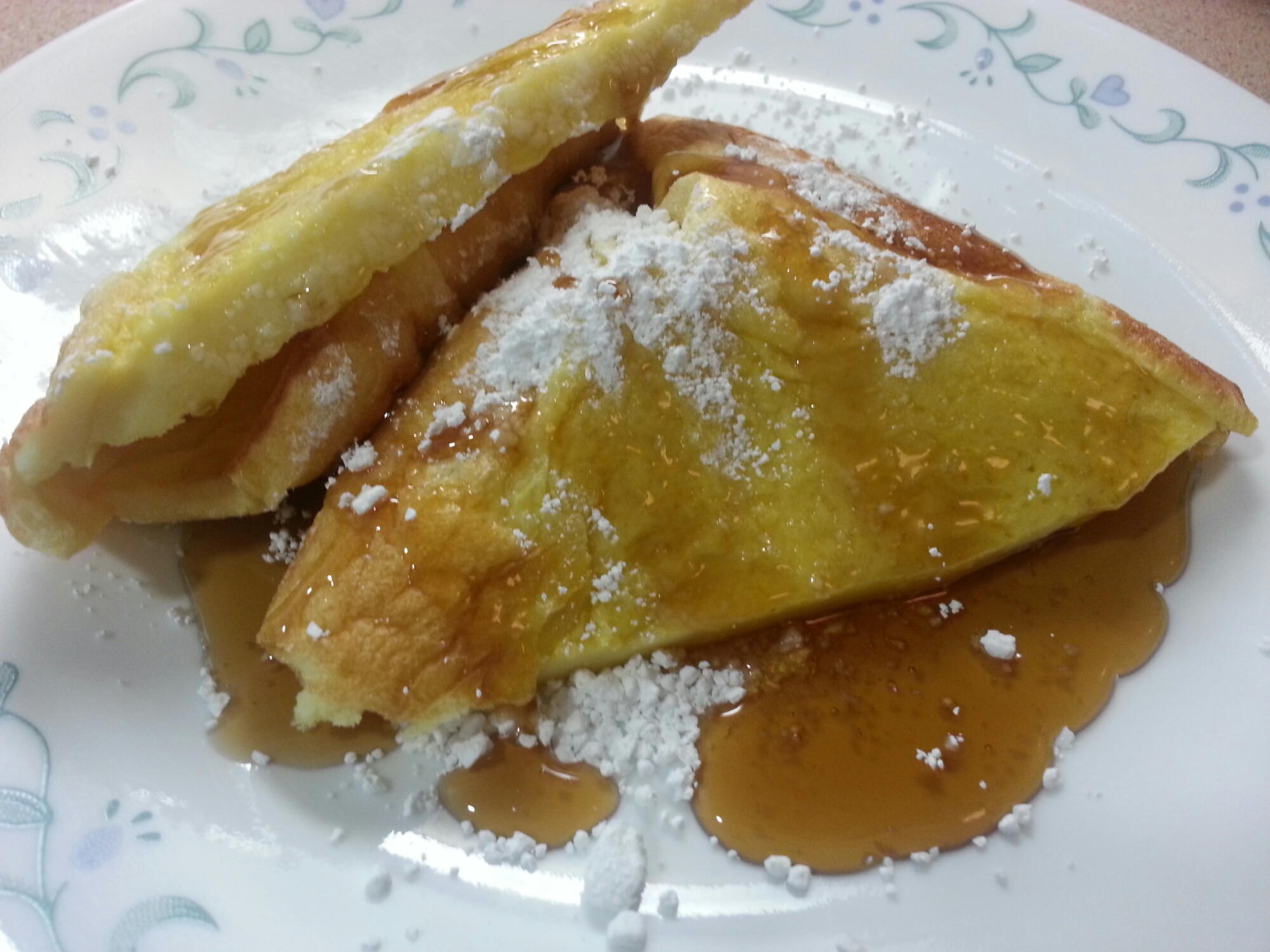 This is what it looks like when it’s done. Now all you have to do is separate and enjoy. Don’t forget to sprinkle with powdered sugar and add a drizzle of syrup.