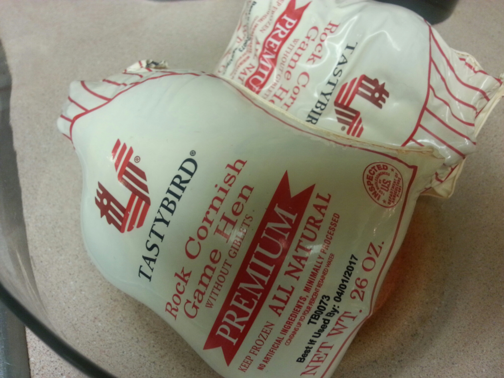 Unwrap your little game hens and make sure the inside is clean of any giblets or left over parts.