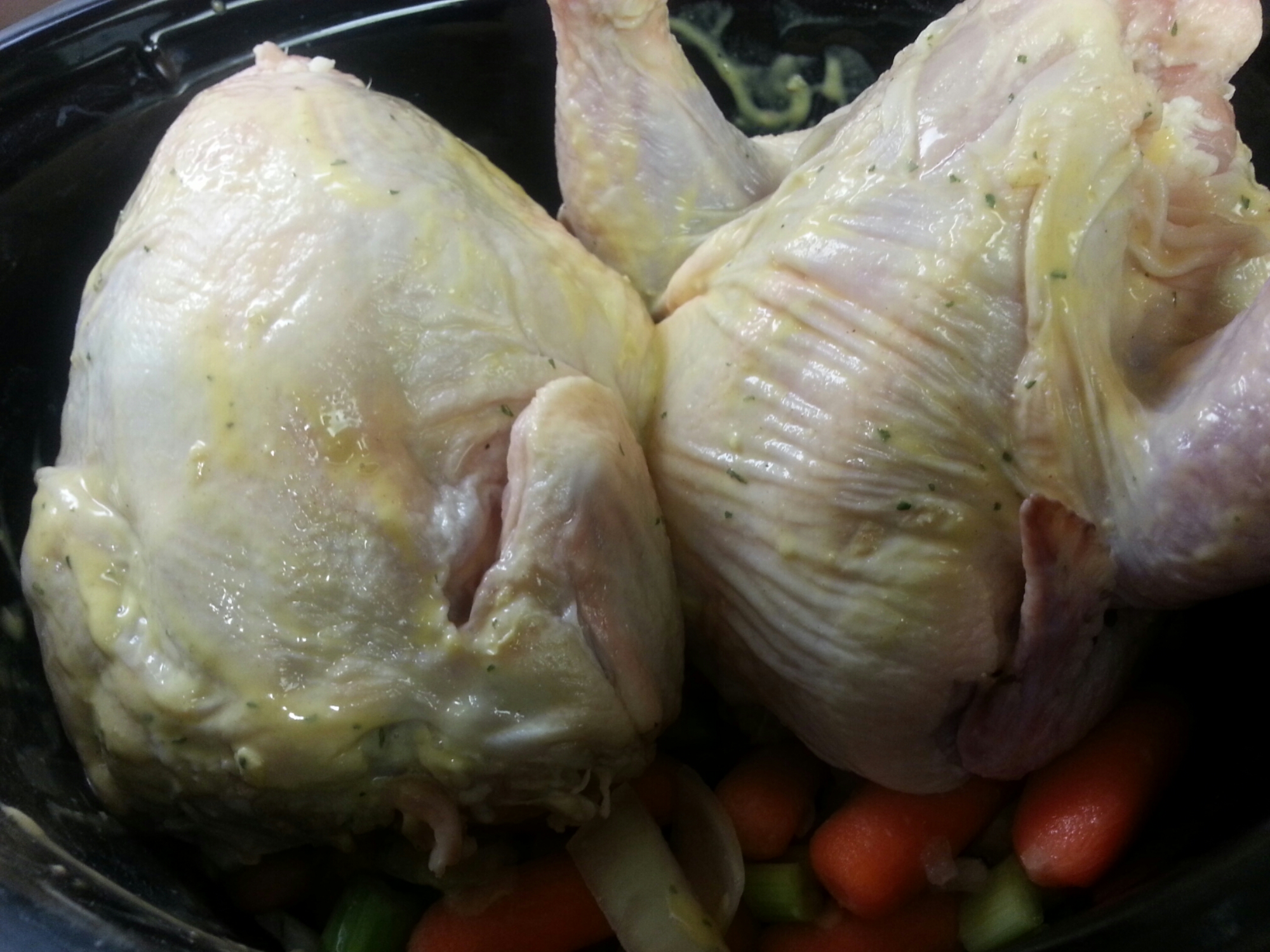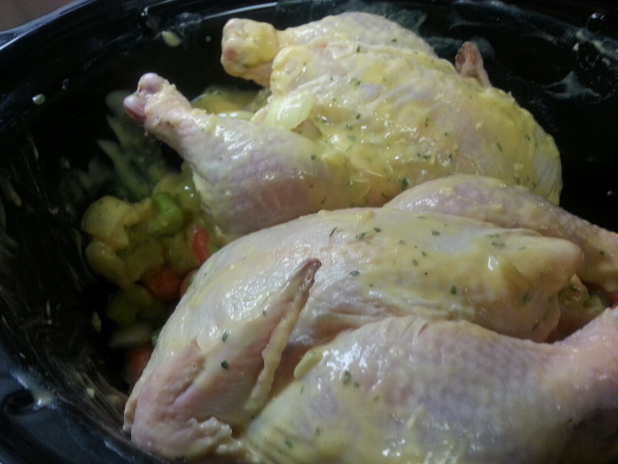 Lay your birds flat into the crockpot on top of your carrots and celery.