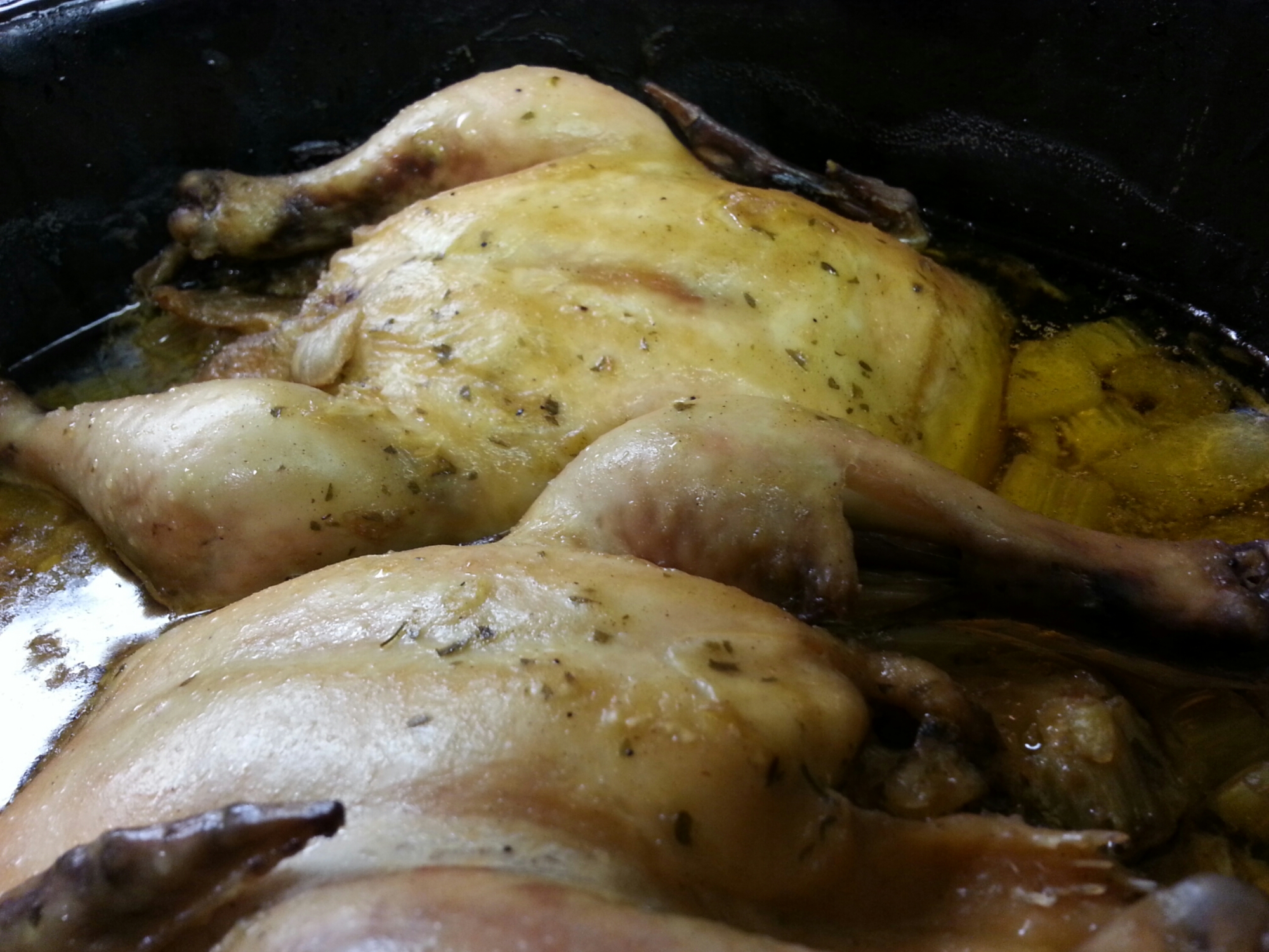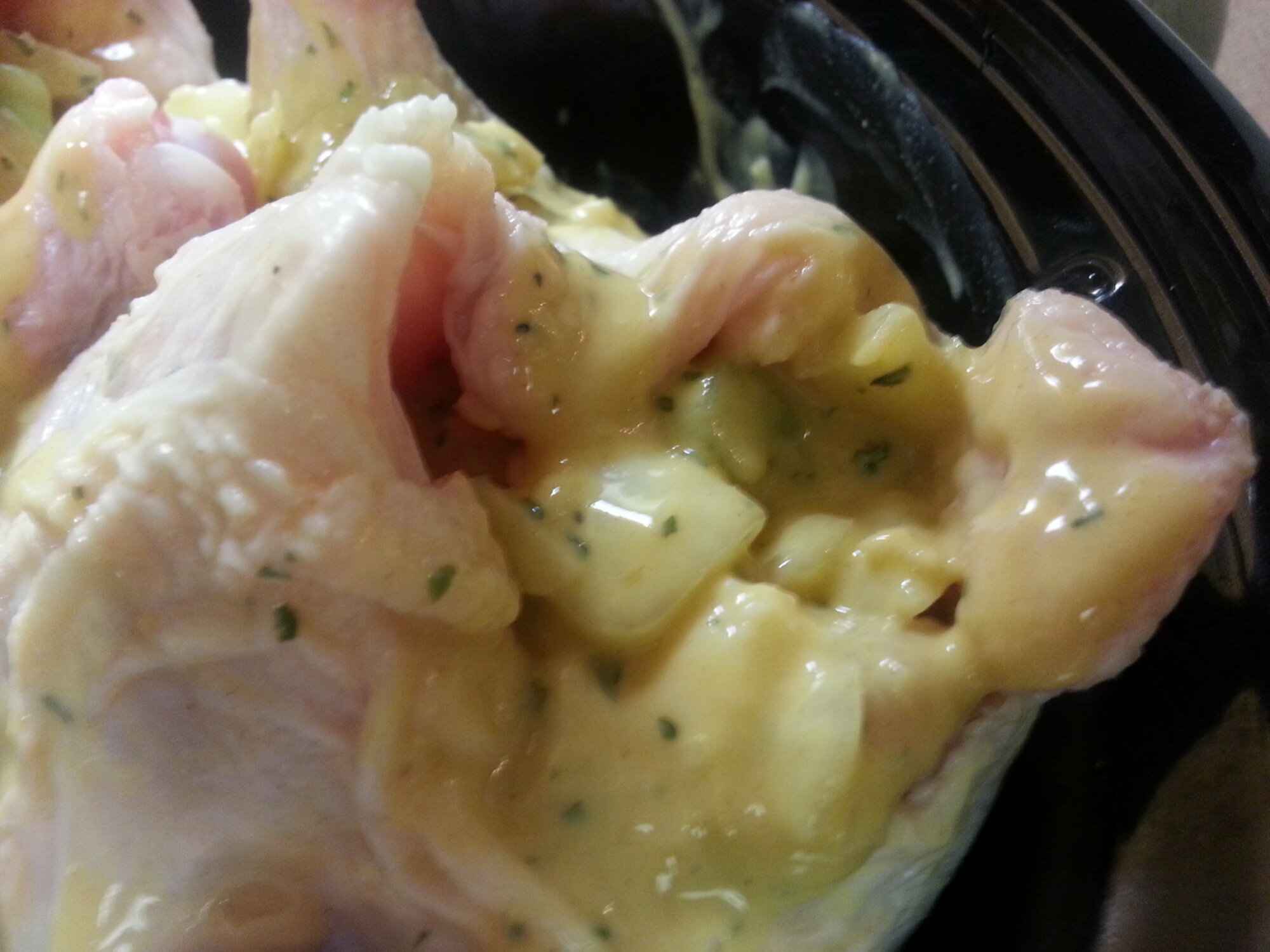 After that step is done, mix the rest of the onion and celery into your dijon mixture. Place inside the cavity of the birds.