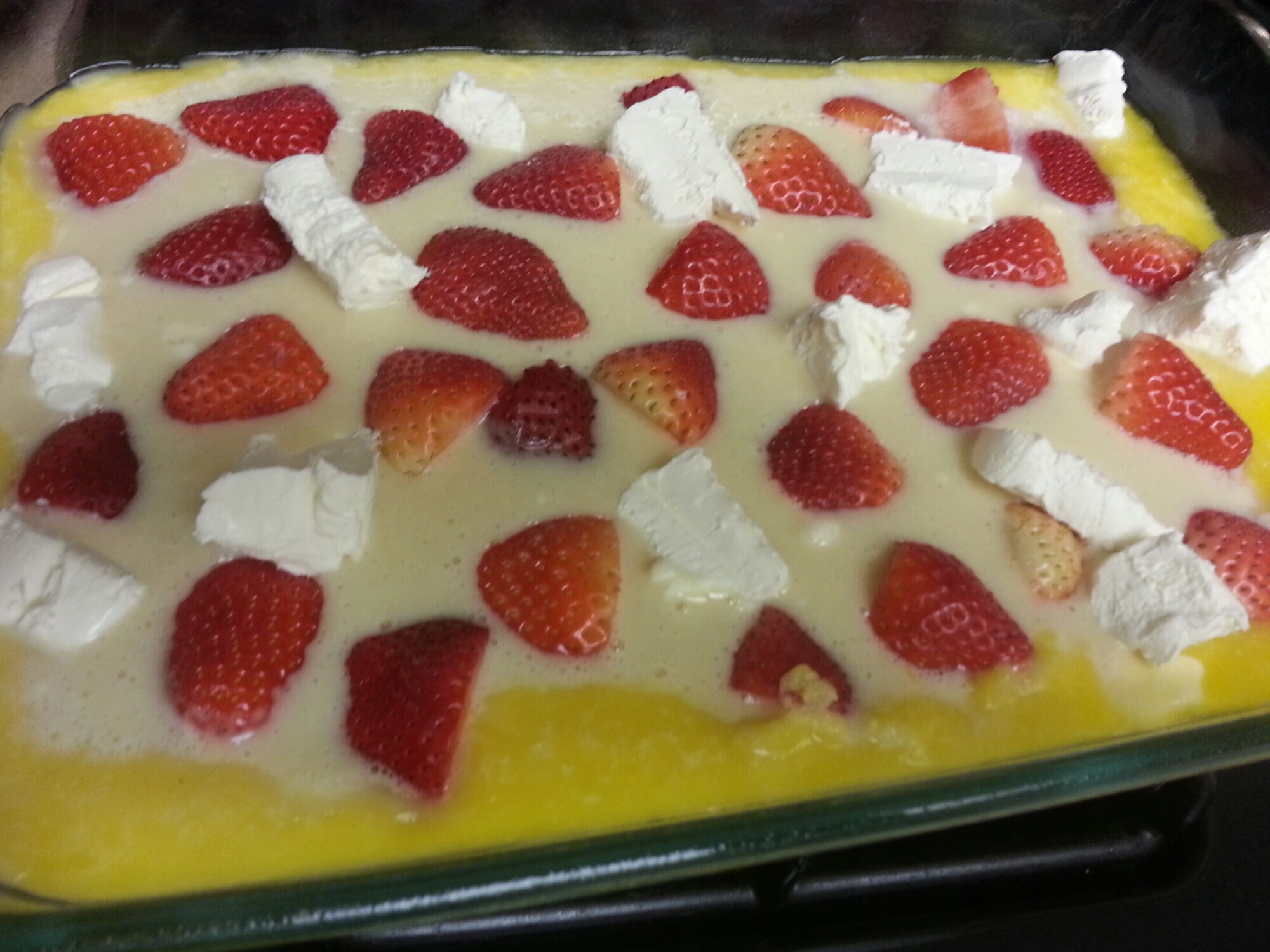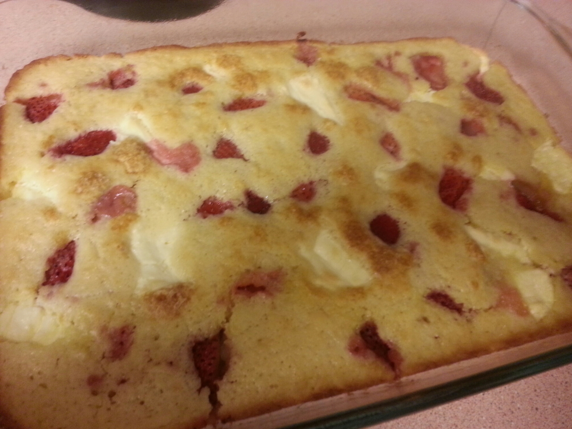 6. Place into a 350 degree oven for 45 minutes. The dough will rise around the strawberries and bubble up to a golden brown color.