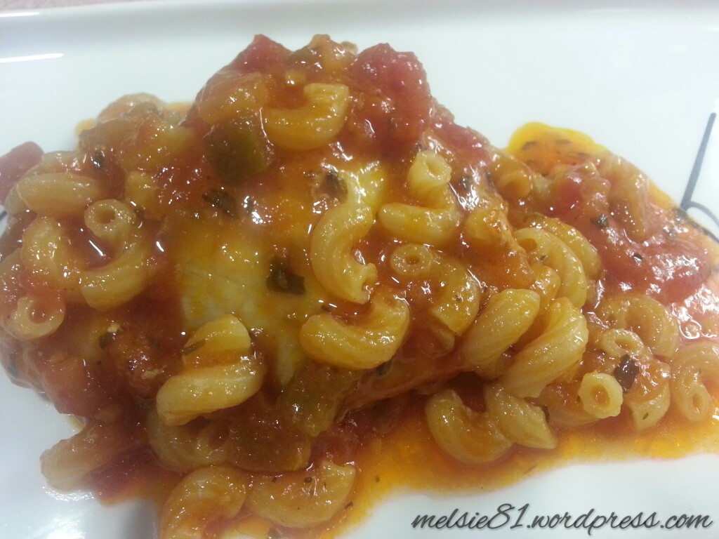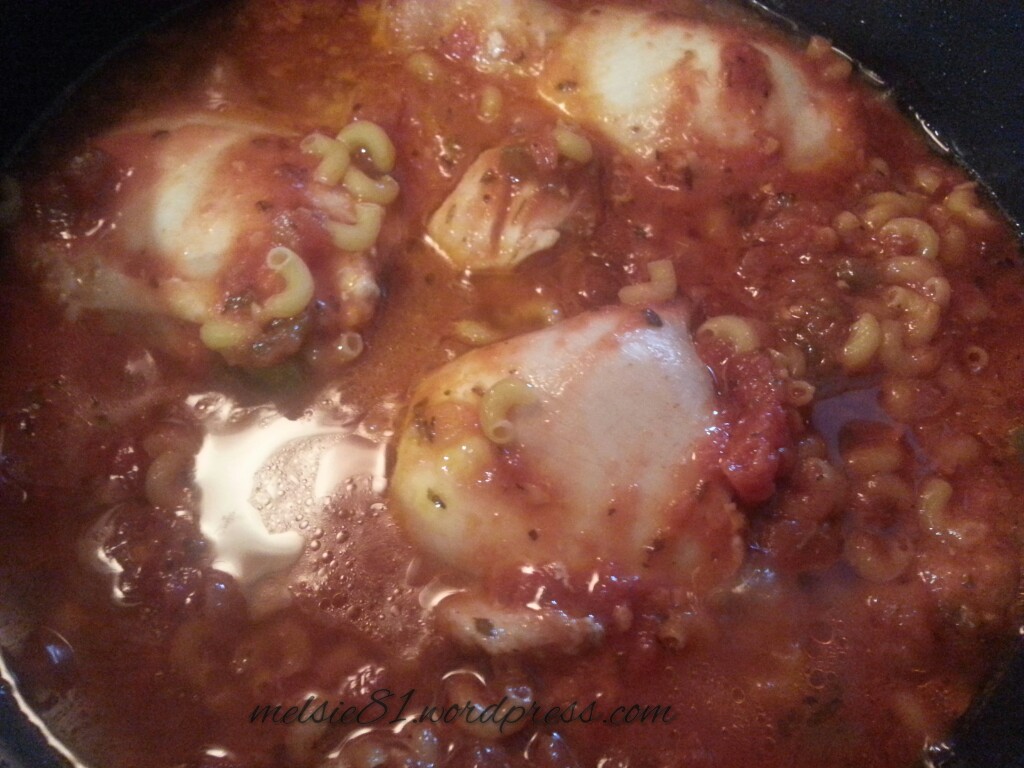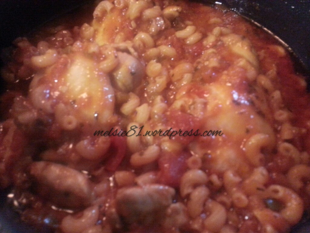 3. Next, toss in your jar of cacciatore sauce and elbow macaroni.