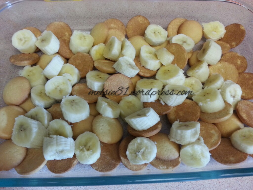 1. Line a 9×13 baking dish with half of the box of vanilla wafers and all of your bananas.